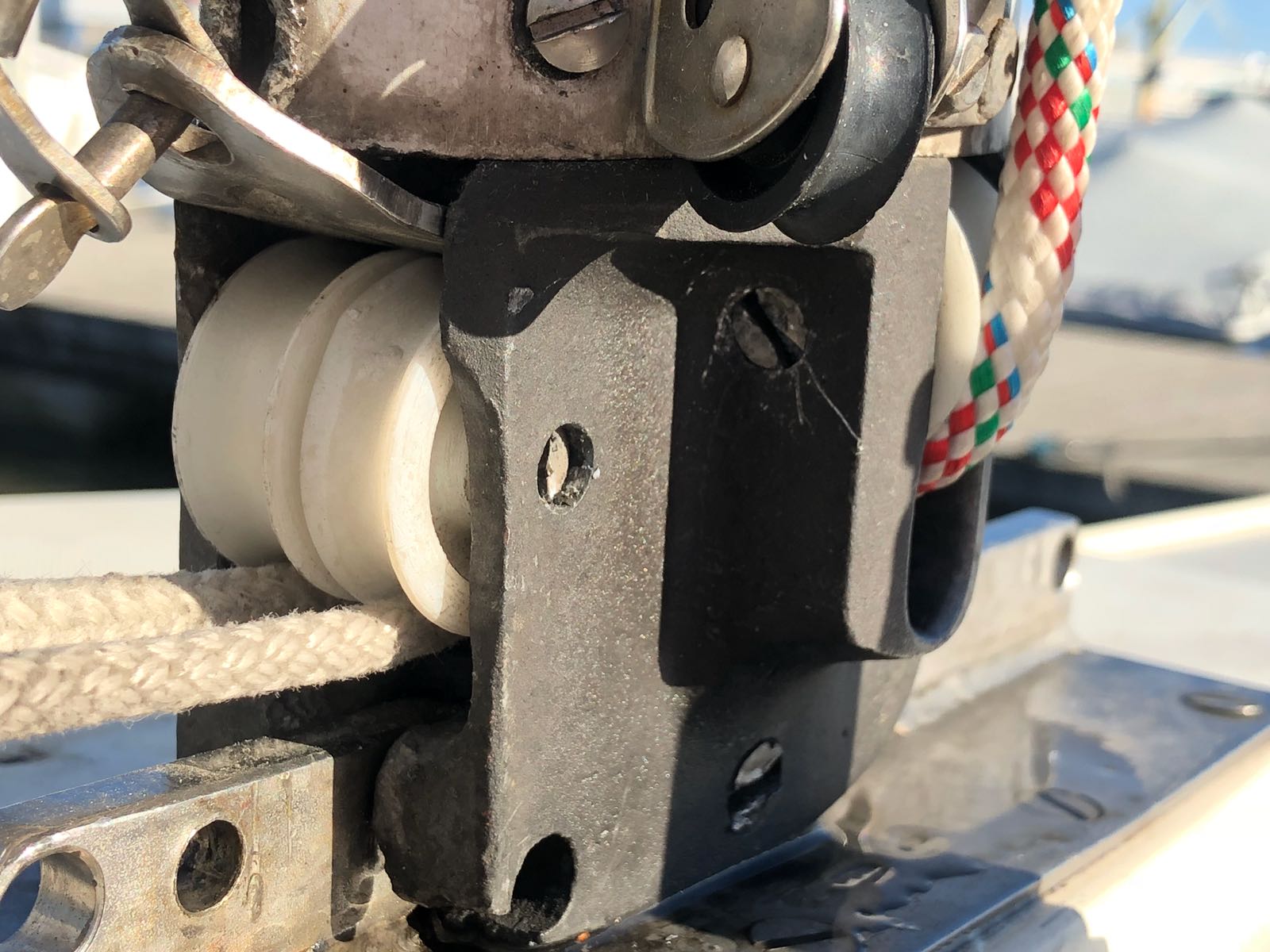 Luulen että tuon irroittaminen olisi helpompaa ja turvallisempaa kun masto on alhaalla. Kannattaa ehkä odottaa syksyyn tai ottaa masto alas, varsinkin kun se yläpään rissa pitäisi katsoa. Ellet ole varma että se on vaihdettu? Vaijerille käytetään syvällä uralla olevaa rissaa, köydelle laakeauraista. Vaihdoin sen omaan mastooni (siihen joka on nyt veneen kera myynnissä <- mainos muita lukijoita varten!) muutama vuosi sitten ja silloin kiersin aika monta paikkaa etsimässä sopivaa. Maritimista lopulta löytyi.