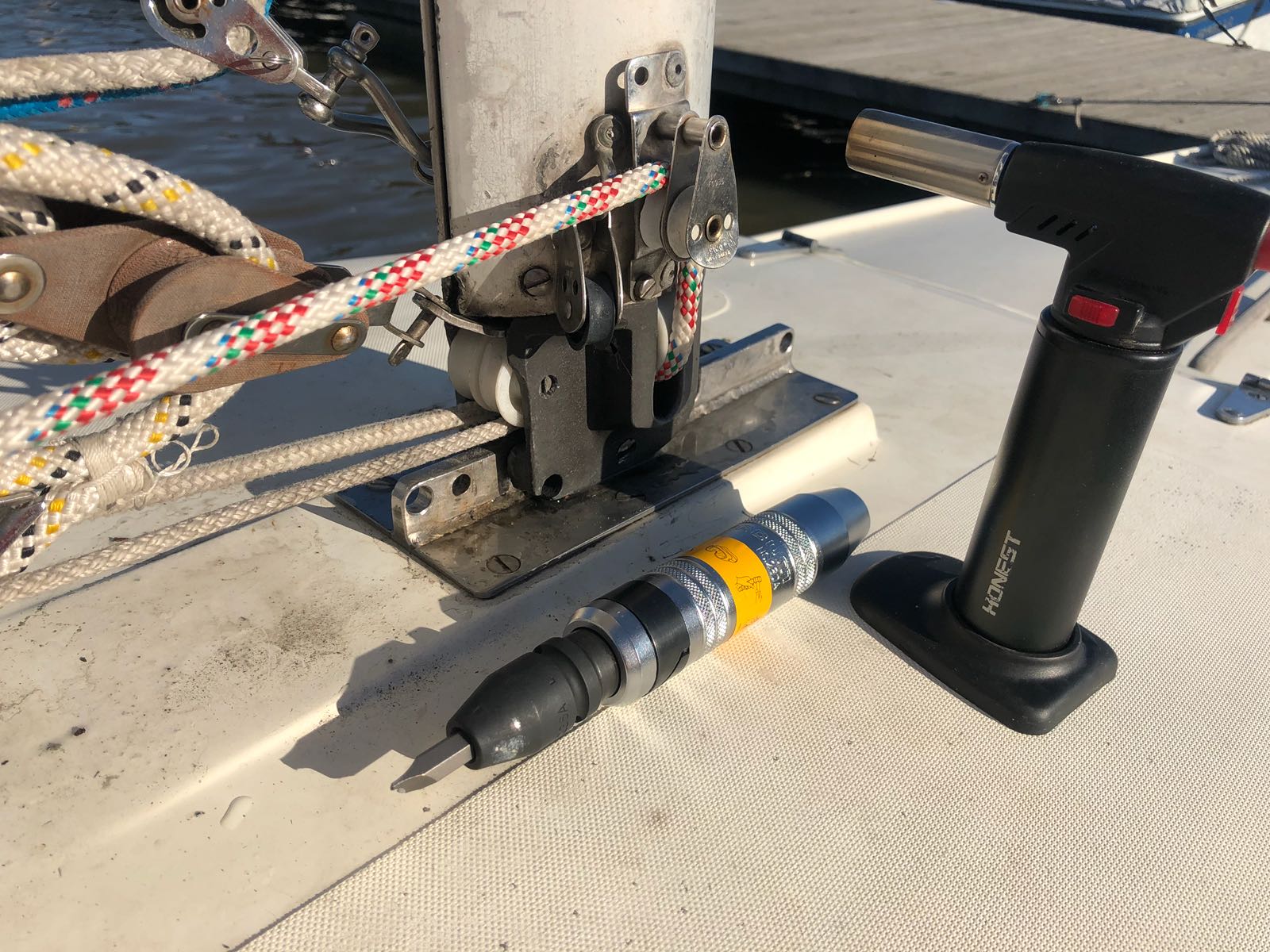 Masto käytettiin alhaalla ja vaihdettii yläpään rissa joka oli tosiaan tehty vaijerille. No saman kokoinen uusi rissa paikalle ja fallin vaihto 4mm dyneemaan ja nyt toimii kyllä todella hienosti. Ison saa vedettyä kevyesti yksin ylös 😀. Alapään rissa saa nyt odottaa syksyä että päästään äkkiä vesille.