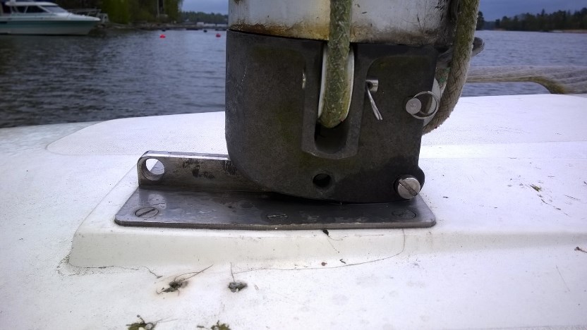 Saattaa tuo kannessa olevan maston aluslevyn takimmainen ohutreunainen reikä pettää ja ruuvikin kuulostaa heppoiselta ratkaisulta. Kannattaa laittaa vanhaan paikkaan (eli keskelle mastonjalkaa ja aluslevyssä osuu sitten koloon) uusi tukeva pultti! Ruostumaton pultti ja siihen vaikka lukkomutteri tai tuplamutteri. Ei ole kallis, mutta toimii ja kestää sitten varmasti.