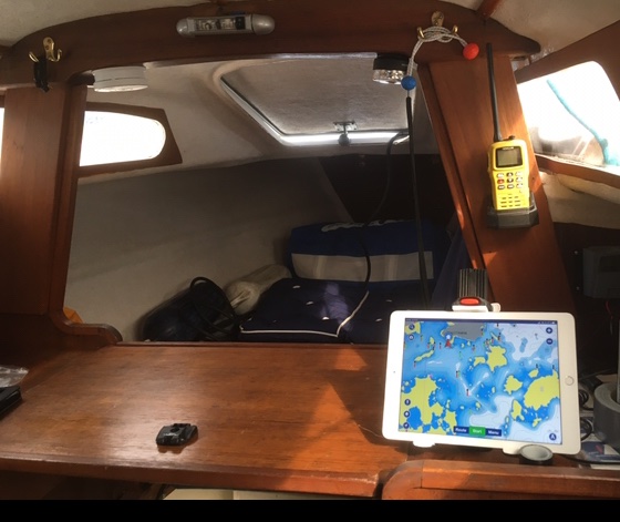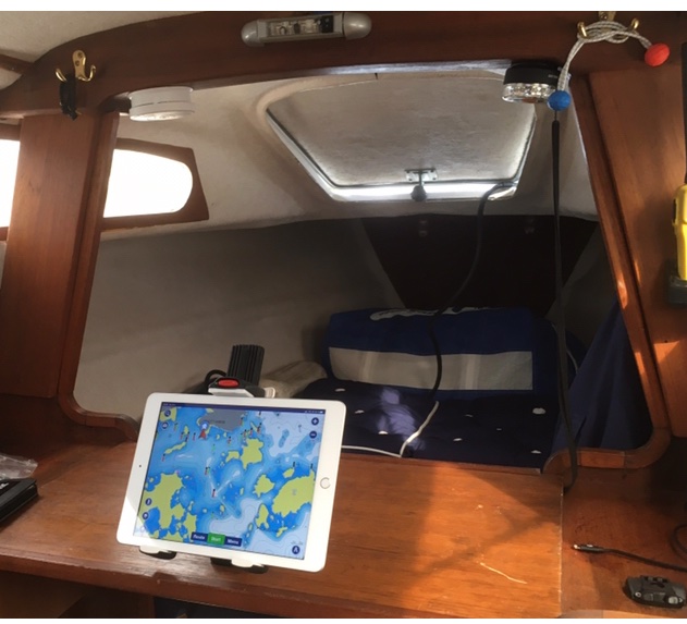 Meillä plotterina on ipad Navionics-ohjelmalla. Laite on sisällä telineessä, siis säältä suojassa ja riittävän hämärässä.