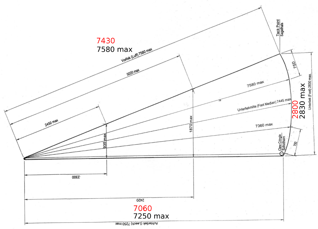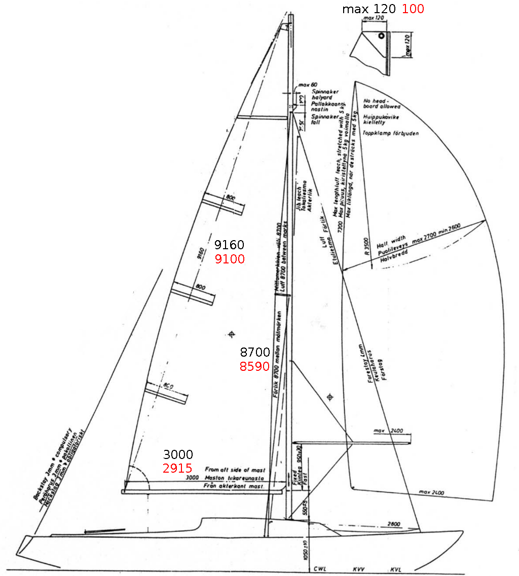 Mitenkäs nämä purjeiden mitat oikein menevät? Kovasti on puhetta siitä, että kaikki H-veneet eivät ole samanlaisia. No minun logiikallani saan omaan veneeseeni sopivat purjeet mittaamalla vanhat. Suurin osa H-veneen piirustuksissa olevista mitoista on merkitty maksimimitoiksi ja loputkin varmasti voidaan sellaisiksi tulkita. Kuinkin olin yllättynyt siitä kuinka paljon pienempiä mittaamani numerot olivat verrattuna noihin maksimimittoihin. Speksin mukaiset mitat ovat alla olevissa kuvissa mustalla ja omat mittaukseni punaisella. Mittaukset olen tehnyt ORC-mittausten ohjevideon mukaisesti eli esim. liikkiköysi ei kuulu mittaan. Purje on mitattaessa ollut venytettynä niin, että ryppyjä ei juuri pitäisi olla.