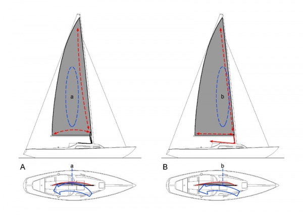 Kuvassa B cunningham on kiristetty ja vene purjehtii navakassa tuulessa. Purjeen muodon syvin osa b on siirtynyt purjeen etuosaan latistaen purjeen takaosaa. Virtaus purjeen pinnalla on esteetöntä ja kallistava voima suhteessa heikompaa.
