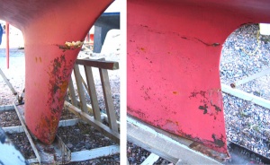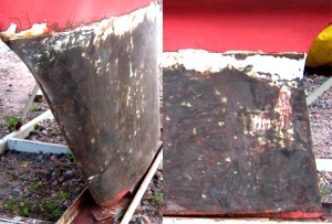 Korjausta tehdessäni huomasin oikeiden työkalujen tärkeyden. Ensimmäinen tehtävä oli poistaa vanha myrkkymaali kölistä. Lainasin tätä tarkoitusta varten poran ja hankin siihen pintojen puhdistukseen tarkoitetun vispilän. Pitkän työrupeaman tulos näkyy toisessa kuvassa, pinta on lähinnä vain kiillottunut vaikka pora melkein paloi ja vispilä oli täysin entinen rautalankojen irrottua.