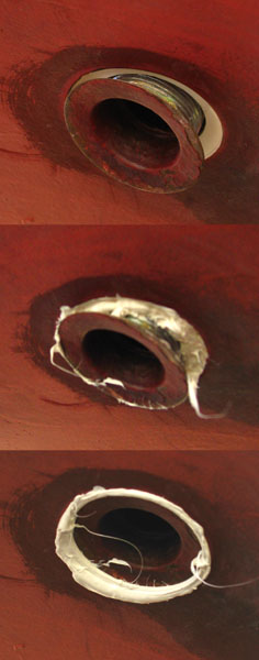 Läpivienti on kiinnitetty ulkopuolelta alkuperäisissä 70-luvun veneissä silikonilla tai uudemmissa yleensä sikaflexillä pohjaan. Meriveteen ja pinnan alaisiin kohteisiin tarkoitettu Sikaflex on yleensä ottaen eniten suositeltu tuote näihin kiinnityksiin. Kuitenkin ohjeisiin tutustuttuani (Venemestari 4/08) luin, että kiinnityksessä tulisi pohjustuksen jälkeen käyttää samaa ainetta millä läpivienti on aiemminkin kiinnitetty tai poistaa vanha aine huolellisesti. Omassa remontissani läpivienti oli edelleen kiinni pohjassa joskin löysällä joten vanhan aineen poistaminen oli työlästä.