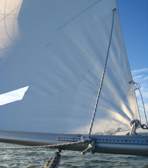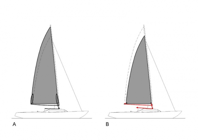 Kuvassa B purjetta on reivattu tyypillisesti metrin verran maston huipusta alaspäin. Reivauksen oikaiseva voima on selvästi havaittavissa.