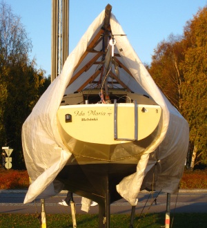 - Veneen voi myös nostaa ns. yhden pisteen nostolla kölipulteissa olevasta nostolenkistä. Yhden pisteen nostossa tarvitset myös kulkuaukkoon tulevan tuen, jonka läpi nostovaijeri kulkee (estää kulkuaukon renojen hankaantumiesn ja veneen kallistumisen) (Kirjoittakaapa joku kokemuksia!)