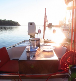 Tässä esitetty pöytä on monen Tee-itse-osiossa esitellyn ratkaisun tapaan omaan veneeseeni räätälöity ja saattaa toimia muissa veneissä vain pohjana jatkoideoinnille. Lähtökohtana tälle idealle on pidetty tarvetta saada sama pöytä sekä ulko- että sisäkäyttöön ja varastoitua se huomaamattomasti väliajoiksi. Ratkaisuna on sisällä salongin punkkien reunoihin ja ulkona levankiin tukeutuva suoraksi taittuva ohut levy, jota voidaan säilyttää yöunia vaivaamatta punkan patjan alla. Rajoitteena tämän pöytämallin käyttöön on kaukalossa tarvittava matala levankikisko, sillä sama ajatus ei toimi korkeammalla levangilla. Tämän ohjeen sovittaminen omaan veneeseen kannattaa aloittaa mittojen mukaan leikatun pahvimallin avulla, jolloin pöydän toiminta sisällä ja ulkoa on helpompi tarkistaa.