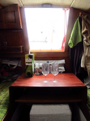 Sisäkäytössä pöydän molemmat päät taitetaan 90 asteen kulmaan ja sujautetaan salongin punkan reunojen ja patjojen väliin, jolloin sopiva paikka pöydälle voidaan järjestää mistä tahansa punkan pituudelta. Käytännössä pöydän ollessa kulkuluukun alla sitä käyttää mukavasti kaksi aikuista ja pöydän ollessa salongin laatikostojen päässä sitä pääsee käyttämään jotenkuten kolme aikuista.