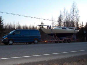 H-vene kulkee näppärästi trailerin päällä. Vene trailereineen painaa alle 2000 kg, joten vetoautoksi riittää tavallinen paketti- tai maastoauto. Kuvan traileria lainataan kohtuullista korvausta vastaan.